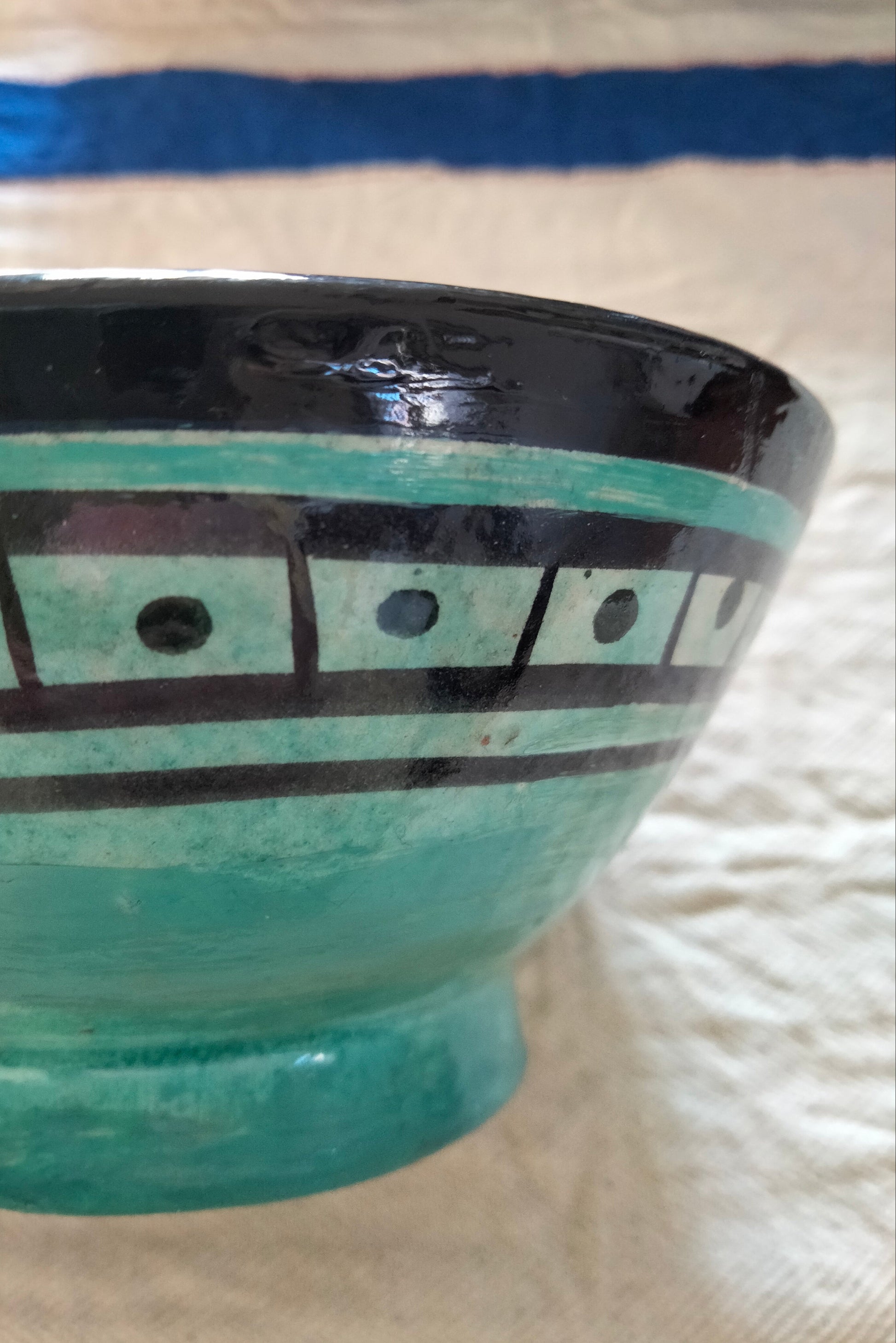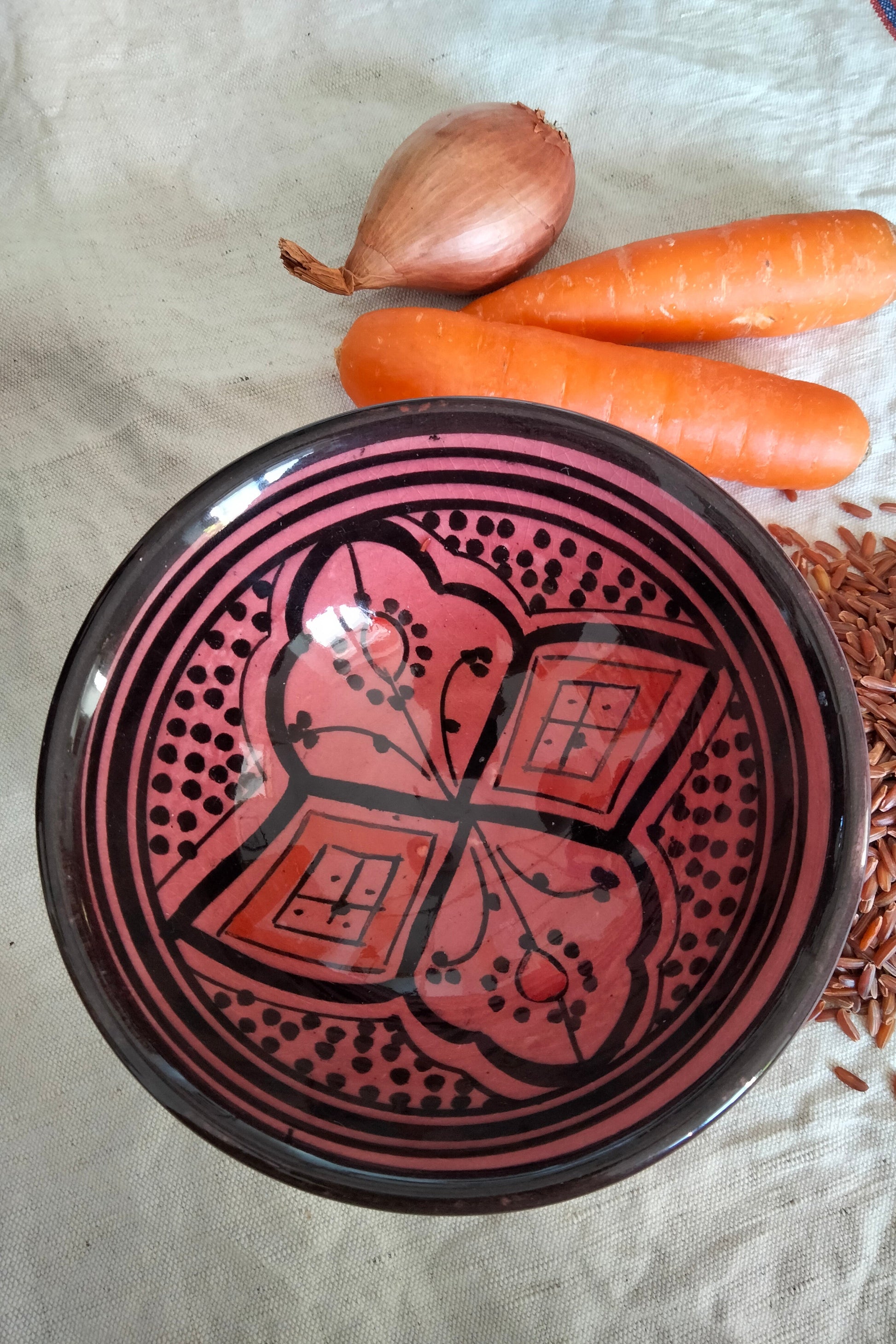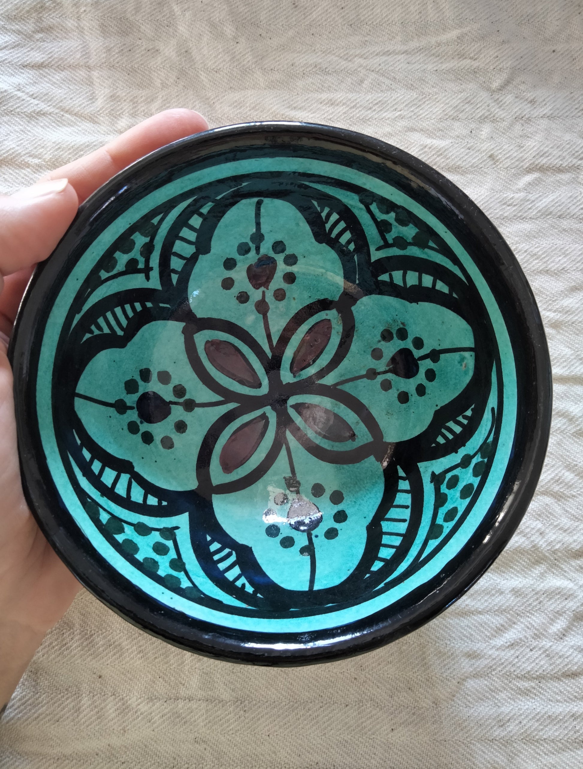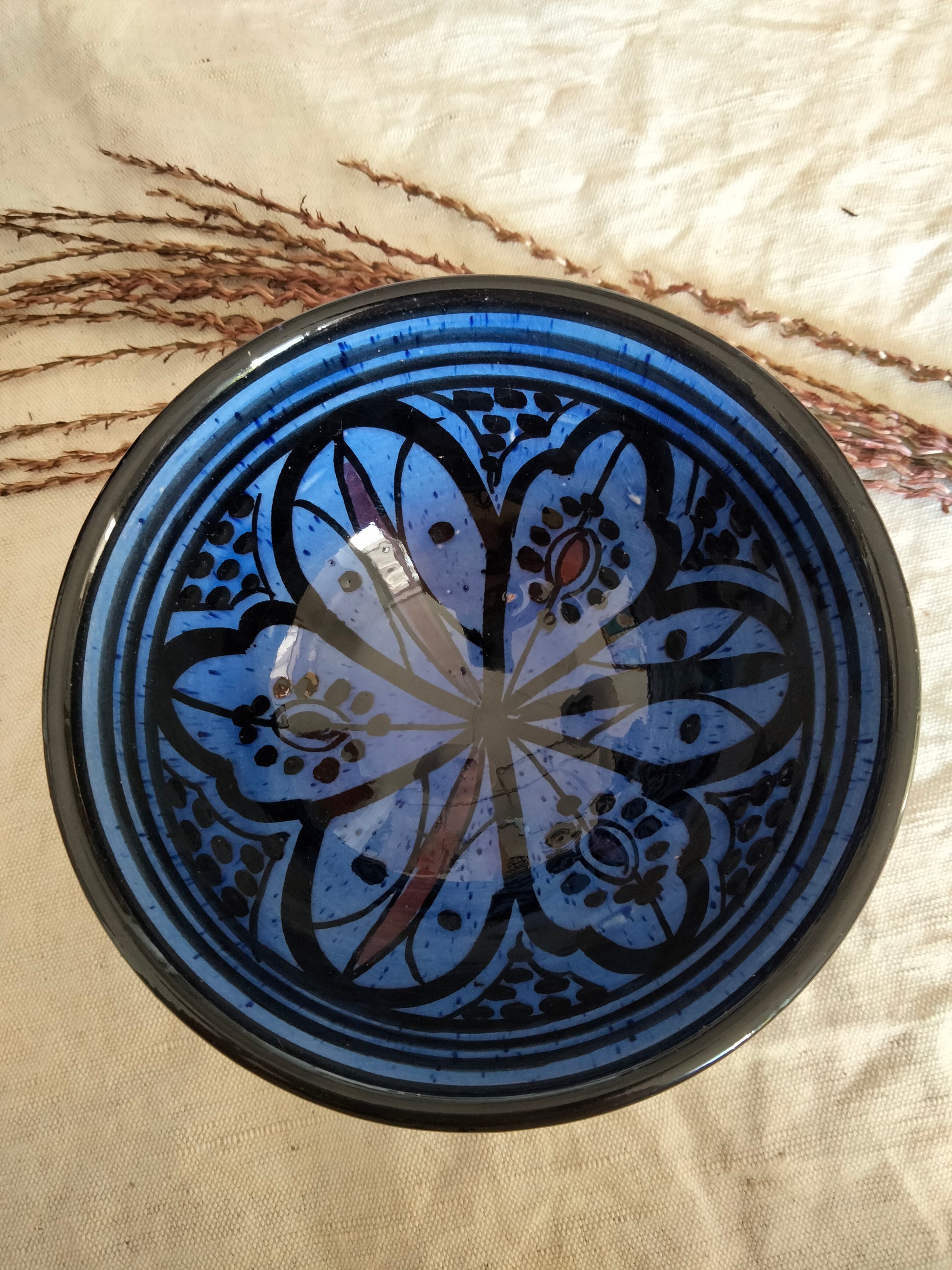Queste bellissime ciotole sono fatte a mano nella bellissima capitale marocchina della ceramica, Safi. Sono realizzate con argilla rossa, cotte nel forno a legna e dipinte a mano con disegni simmetrici tradizionali.
