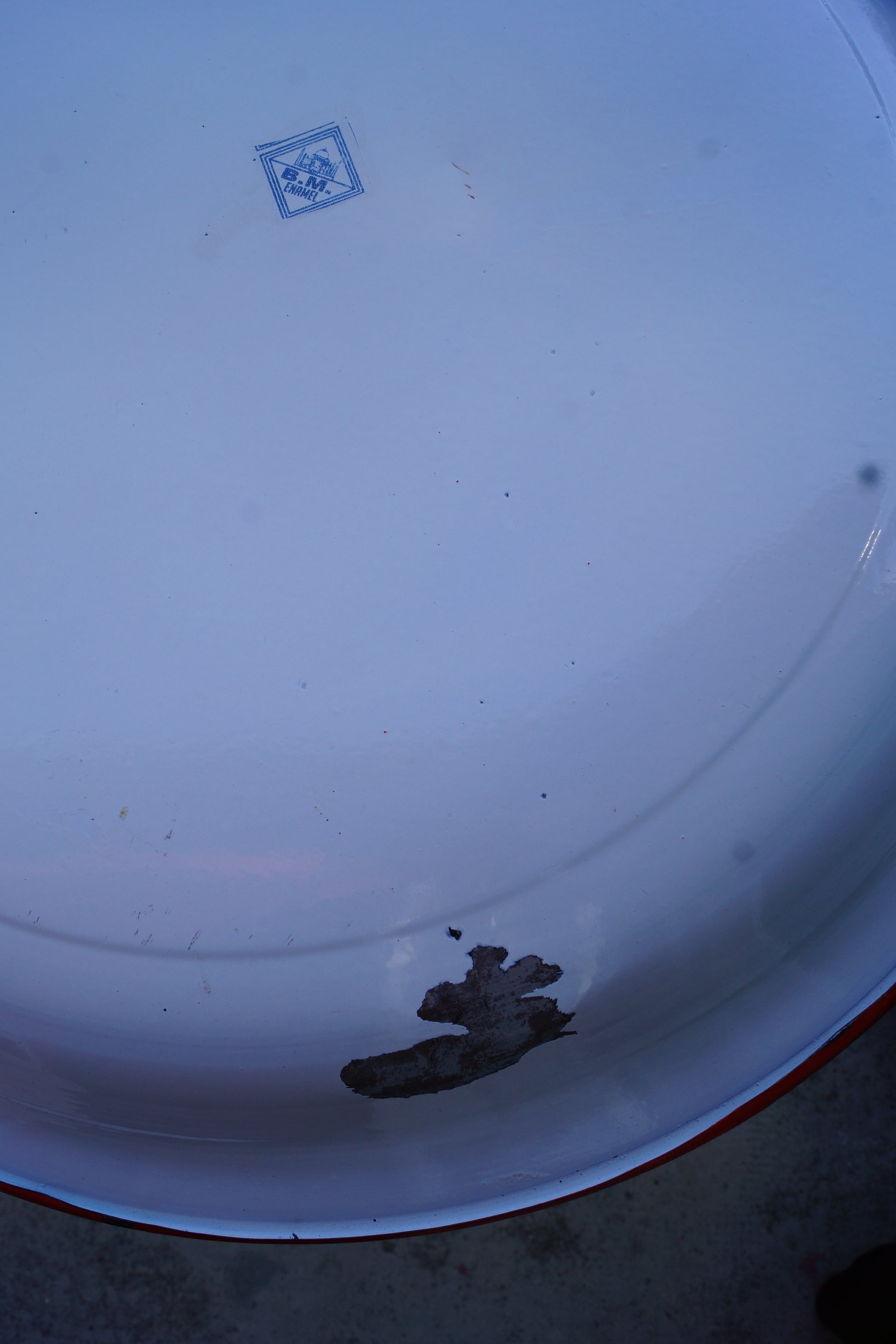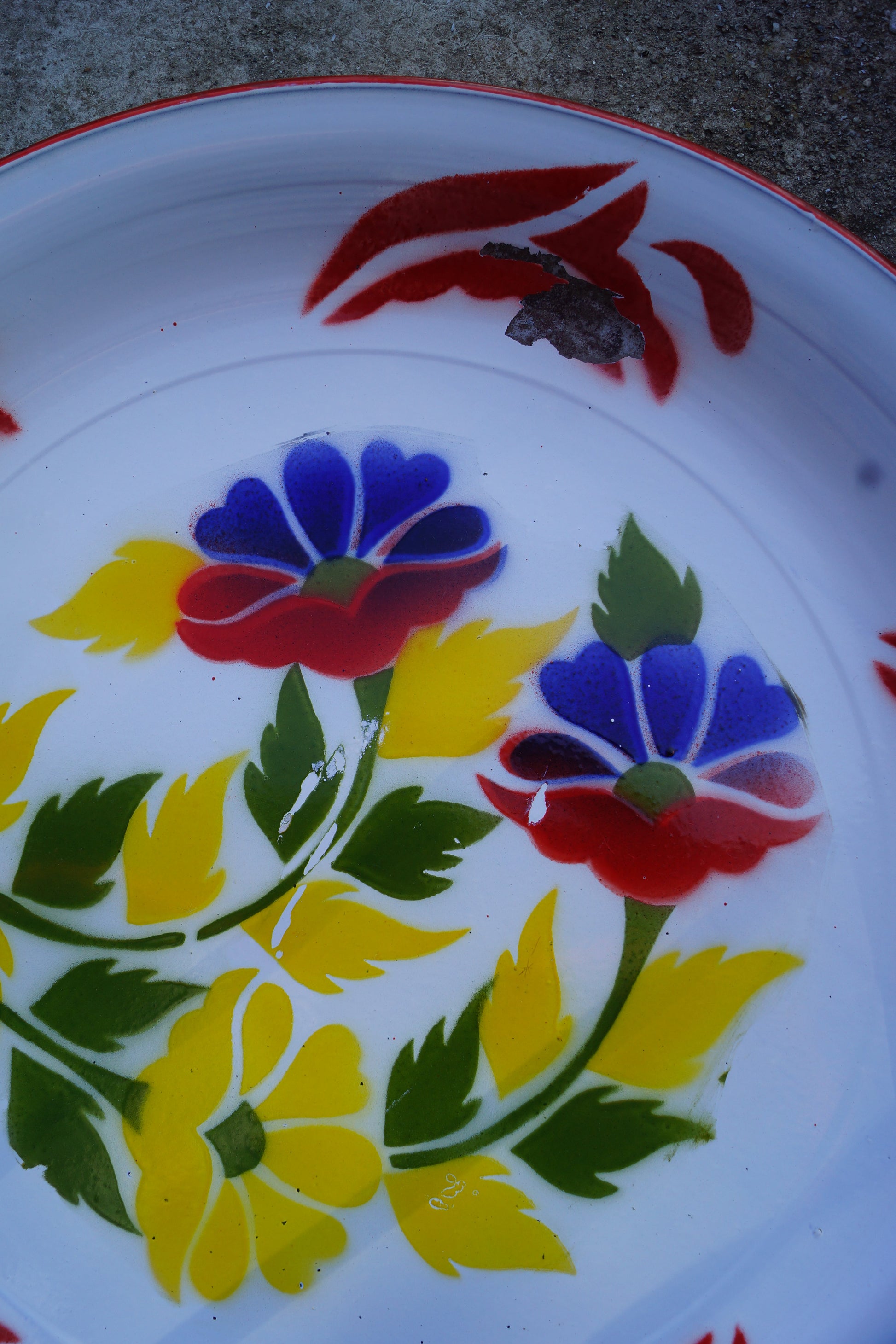 Vassoio in metallo smaltato vintage con decorazione a fiori. La decorazione può variare da prodotto a prodotto, essendo realizzata a mano.