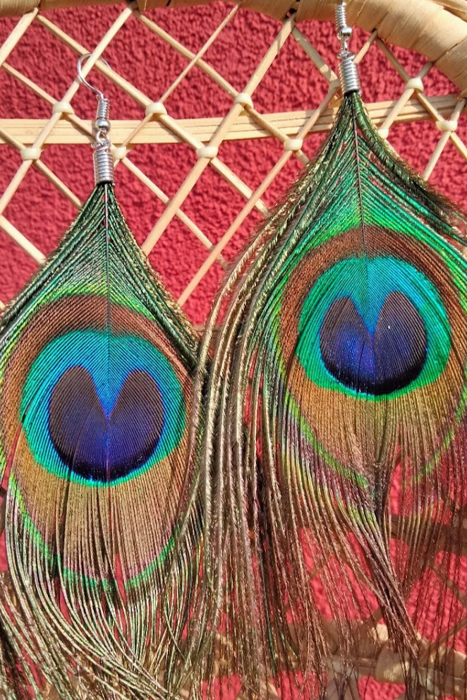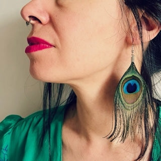 Orecchini con piume di pavone per un look boho e hippie. Nickel free.