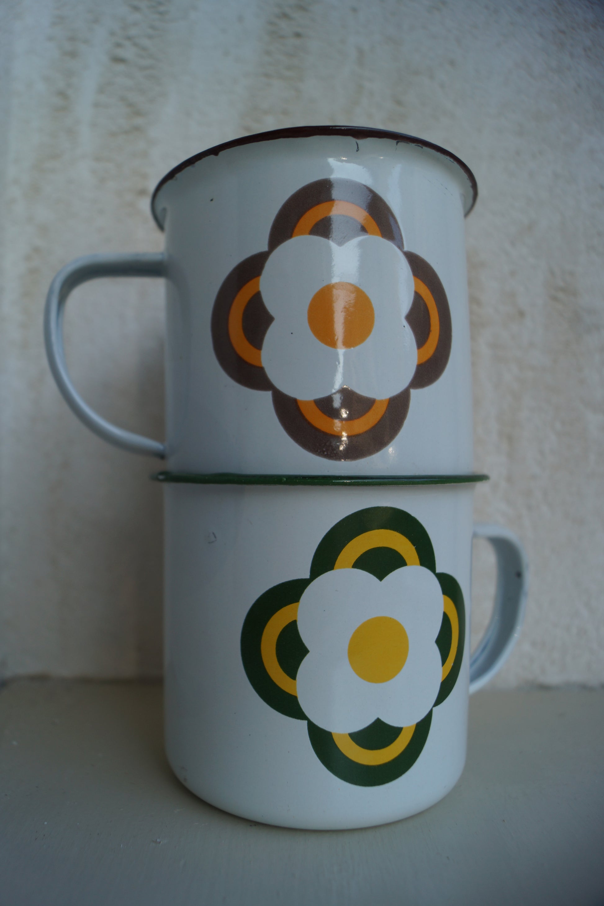 Tazza in metallo smaltato con illustrazione a fiori anni 60.