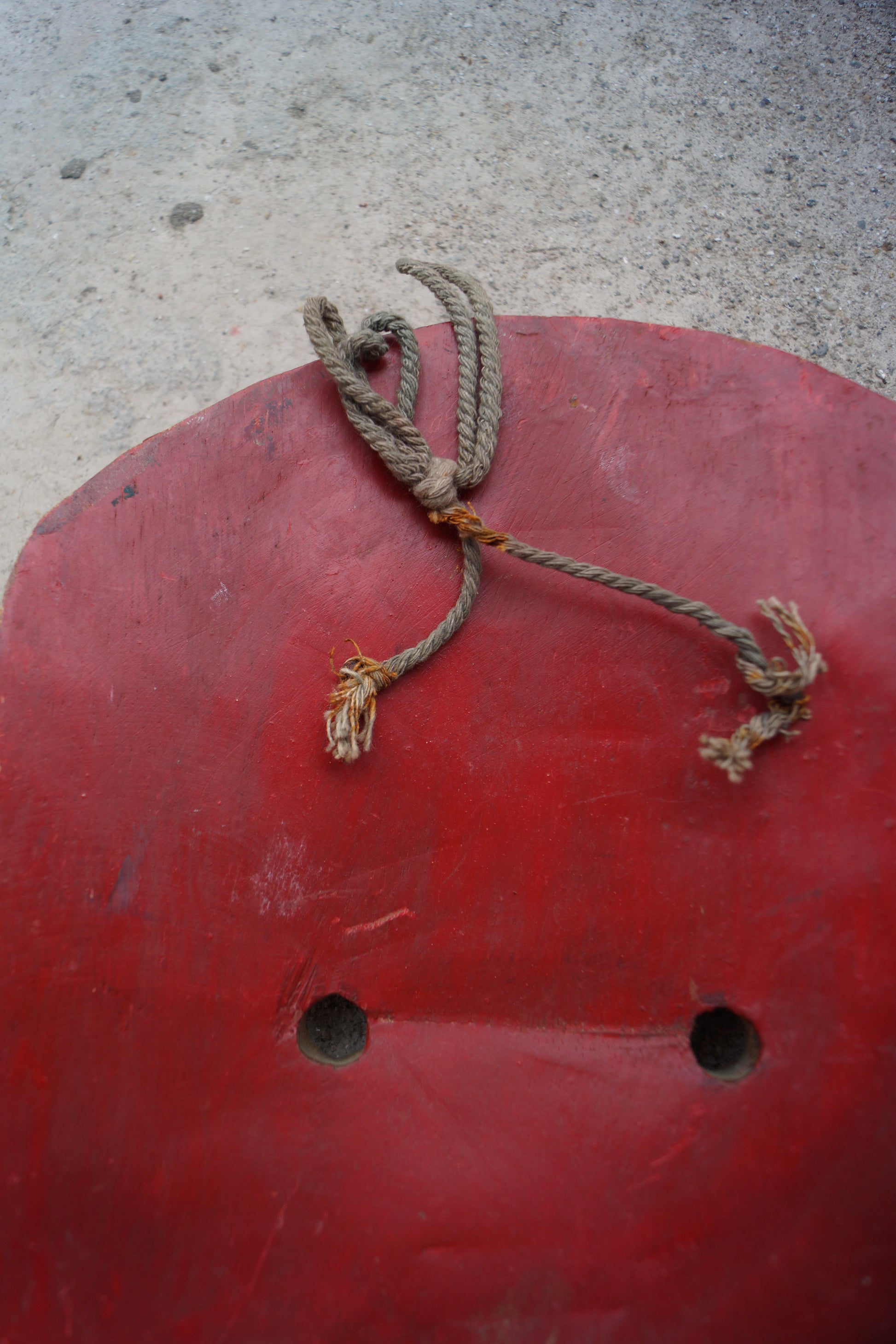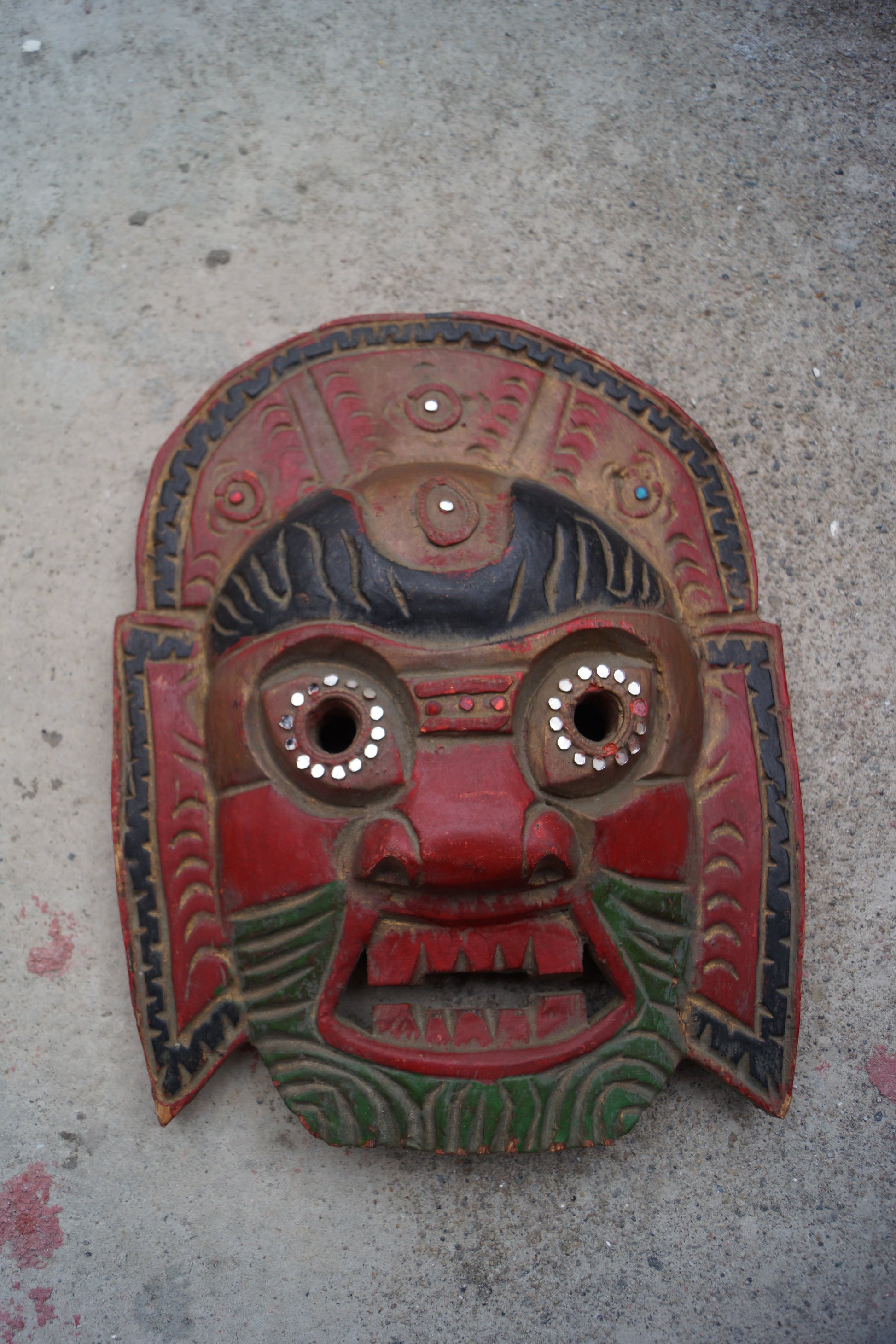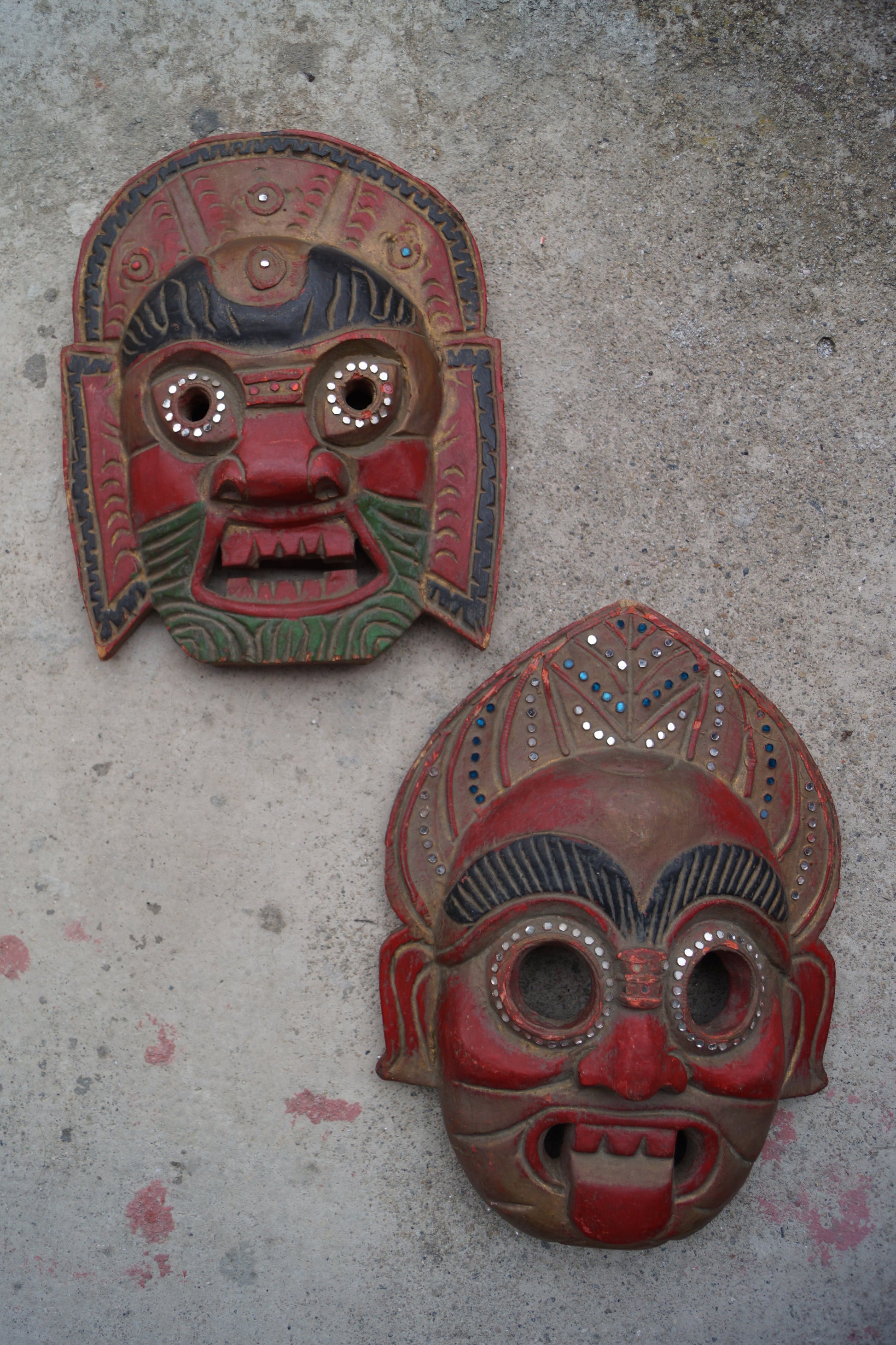 Coppia di maschere tradizionali intagliate e dipinte a mano con laccio originale per essere appese.