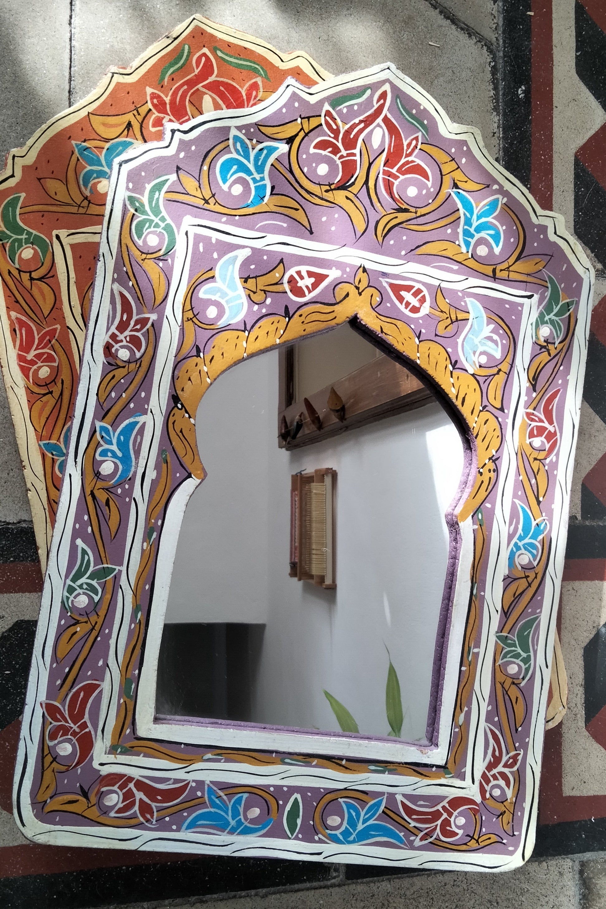 Questi bellissimi specchi marocchini sono dipinti a mano nella splendida città rossa di Marrakech. Con piedini e gancio per essere appesi.
