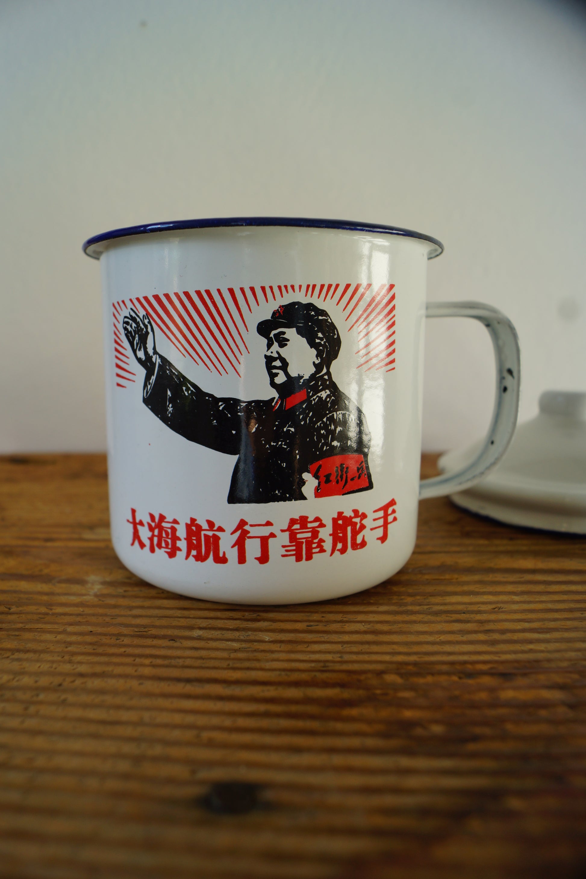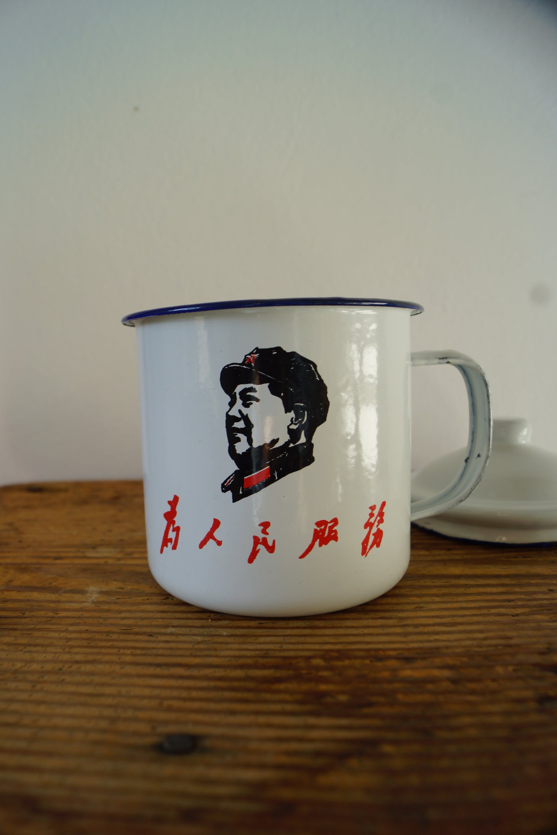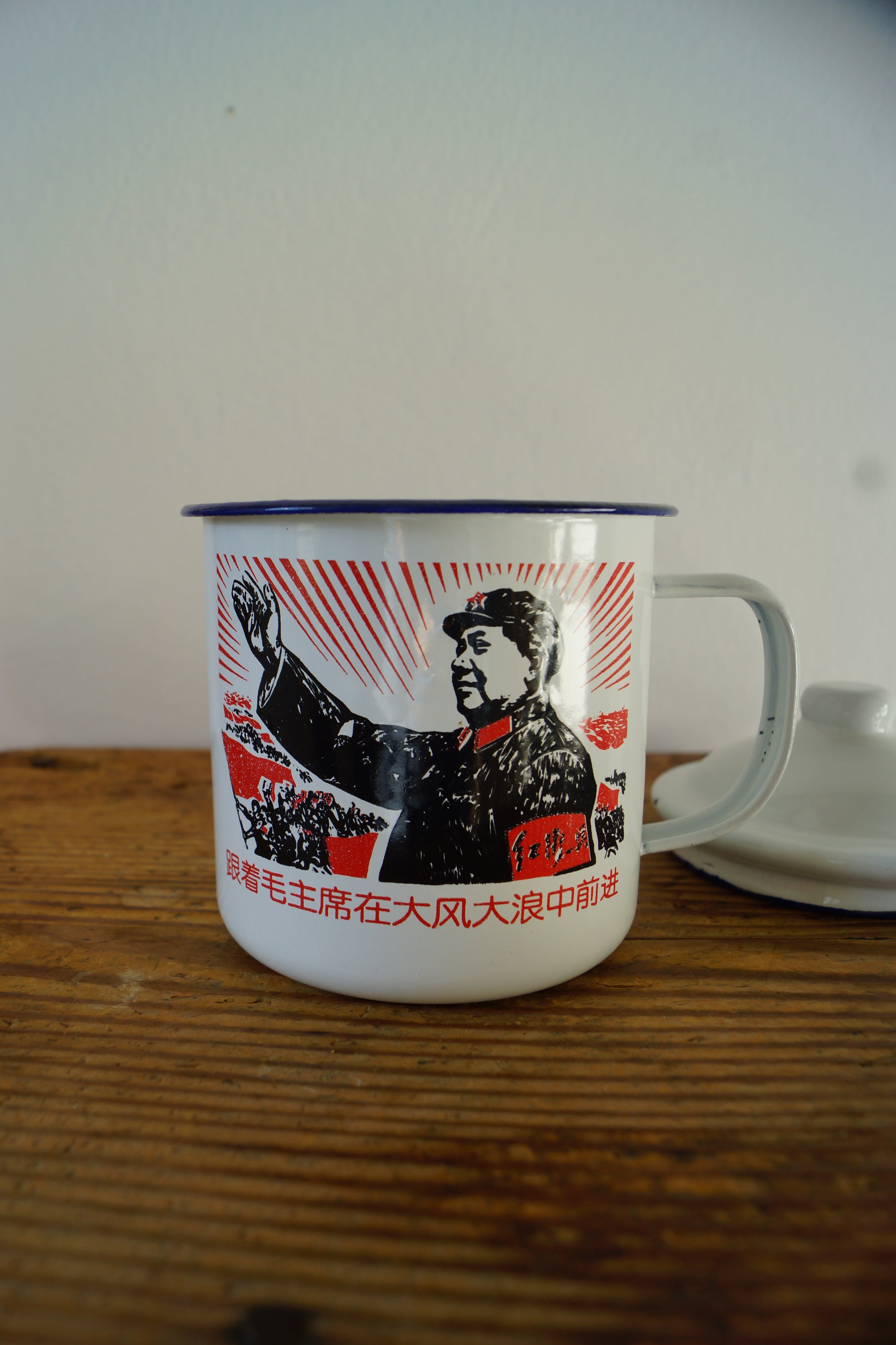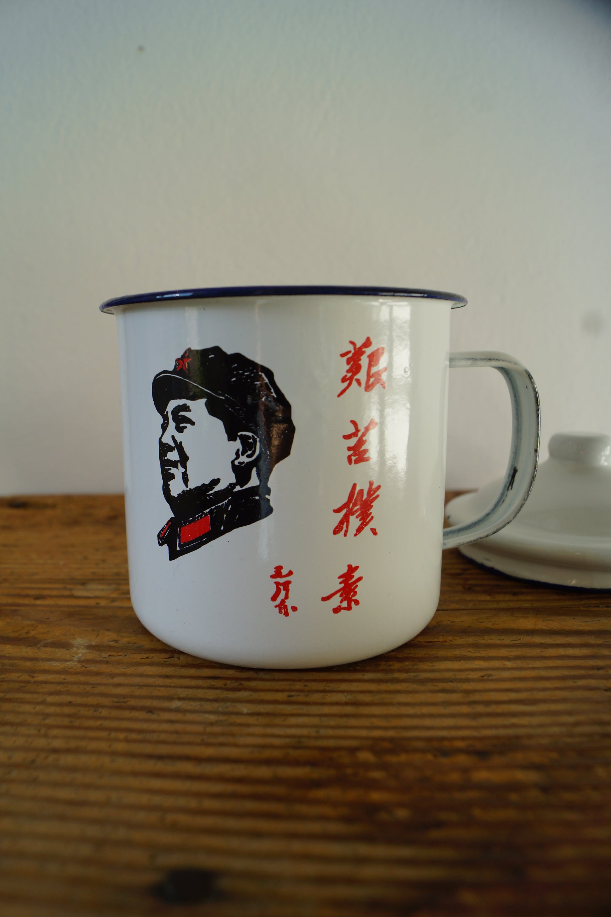 Tazza in metallo smaltato con coperchio e illustrazione di Mao Tse Tung.
